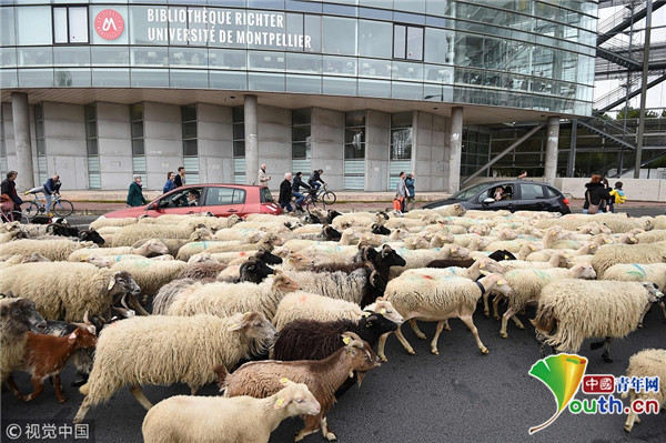 当地时间2018年4月7日,法国蒙彼利埃,大约220只绵羊穿过当地草地,来保护当地的城区草地。