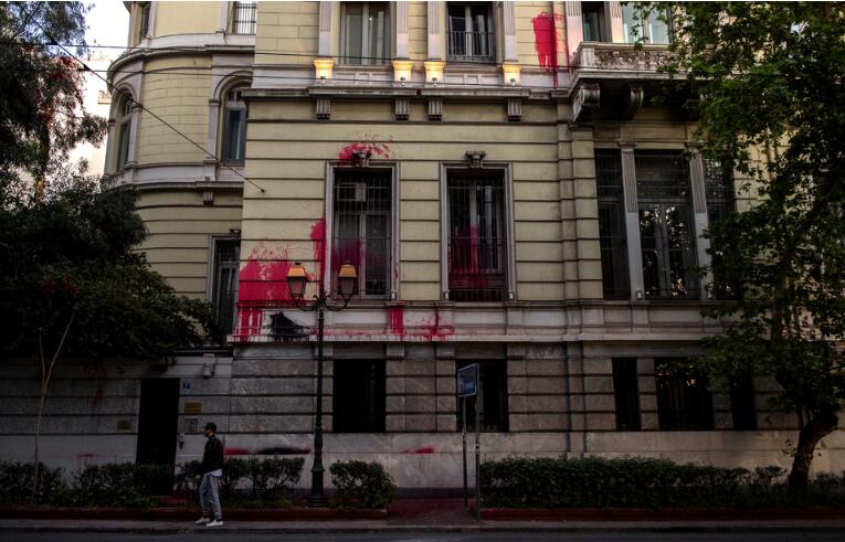 【环球网综合报道】据法国《费加罗报》4月22日援引法新社报道,希腊当地时间4月22日,该国一群无政府主义者向法国驻雅典领事馆泼洒油漆,表达对法国参与联合打击叙利亚的不满。