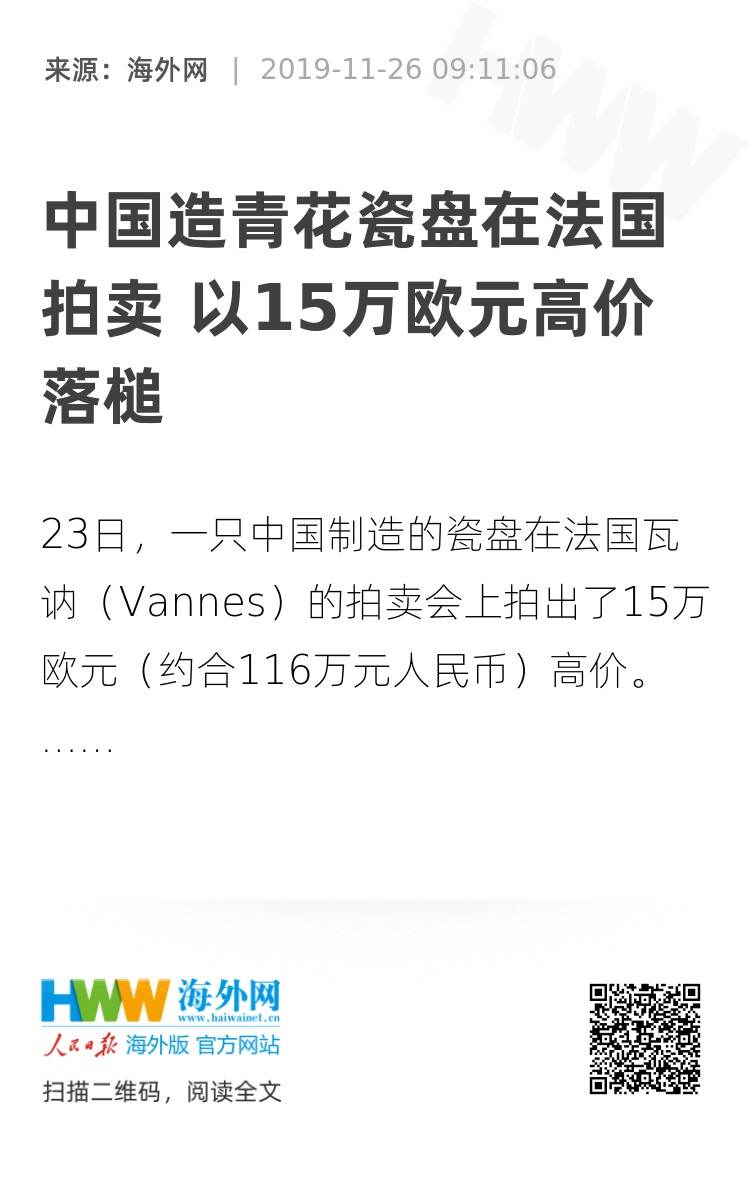 海外网11月26日电 当地时间23日,一只中国制造的瓷盘在法国瓦讷(Vannes)的拍卖会上拍出了15万欧元(约合116万元人民币)高价。