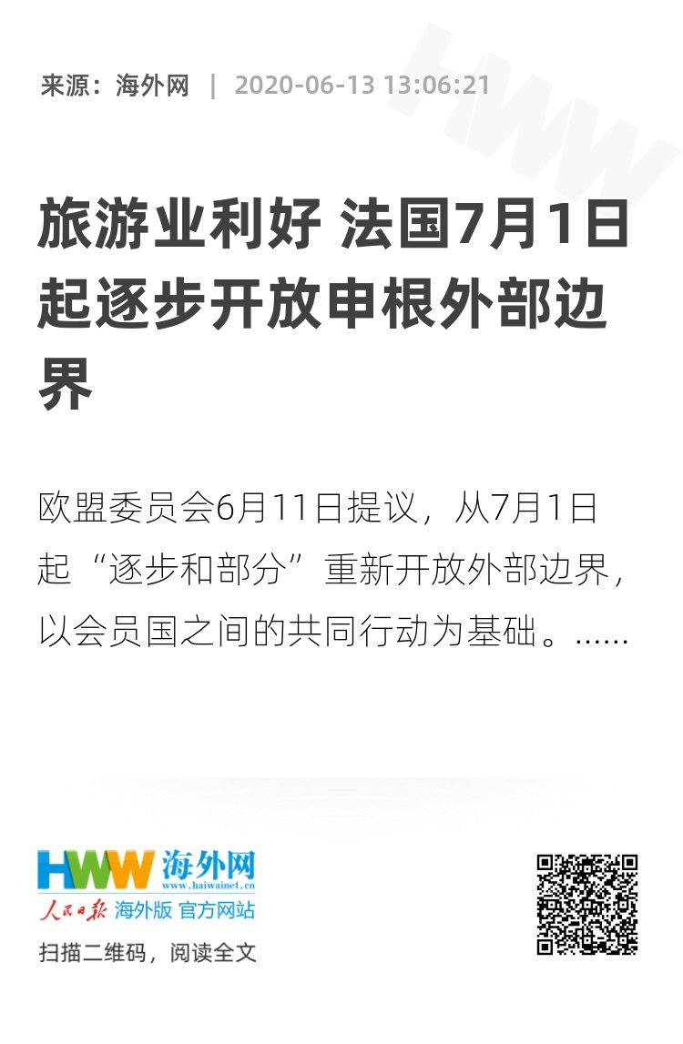 据《巴黎人报》报道,法国内政部长克里斯托夫·卡斯塔内(Christophe Castaner)和外交部长让-伊夫·勒德里昂(Jean-Yves Le Drian)在联合公报中宣布这一消息。他们表示,根据欧盟委员会11日提出的建议做出这一决定,具体开放情况将根据不同第三国的卫生状况以及在此之前欧洲层面商定的安排,以渐进和差异化的方式进行。无论如何,这对旅游业是一个好消息。