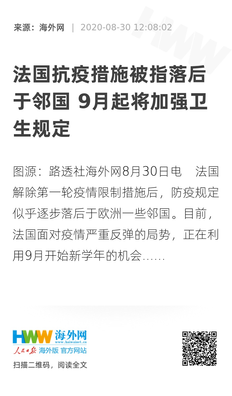 海外网8月30日电 法国解除第一轮疫情限制措施后,防疫规定似乎逐步落后于欧洲一些邻国。目前,法国面对疫情严重反弹的局势,正在利用9月开始新学年的机会对措施进行调整,例如从国家到地方,从街头巷尾到学校和公司都在强制佩戴口罩,同时不排除重启区域性限制规定。