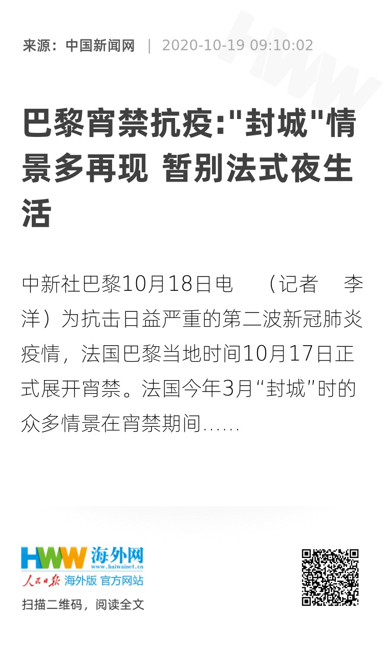 民调显示大多数民众能够支持实施宵禁,并对疫情表示担忧。法国官方多次表示,只有大家共同遵守宵禁等管制措施,措施才会真正发挥效果,疫情才能被逐步遏制。未来四周将再度迎来法国战疫的关键时刻,人们都企盼着宵禁能够让病毒扩散的势头逐步减慢下来。