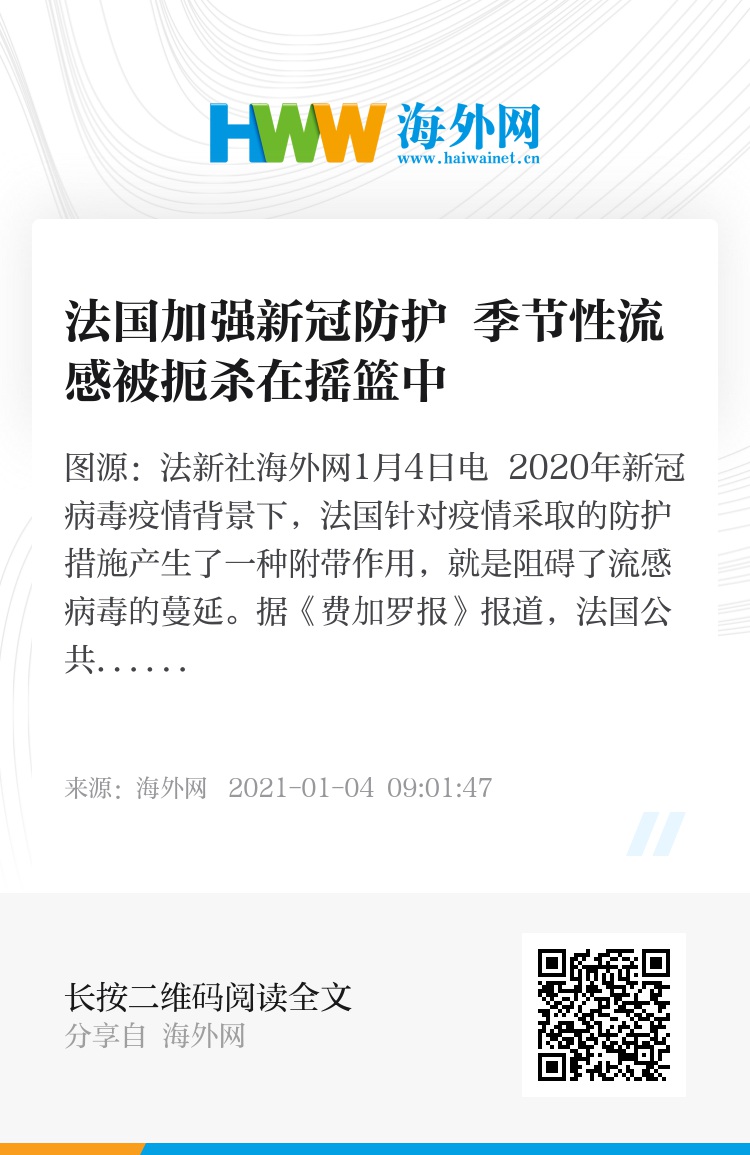 海外网1月4日电 2020年新冠病毒疫情背景下,法国针对疫情采取的防护措施产生了一种附带作用,就是阻碍了流感病毒的蔓延。