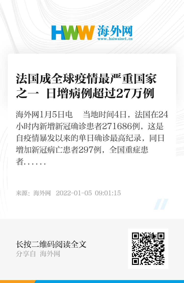海外网1月5日电 当地时间4日,法国在24小时内新增新冠确诊患者271686例,这是自疫情暴发以来的单日确诊最高纪录,同日增加新冠病亡患者297例,全国重症患者现有3665例。