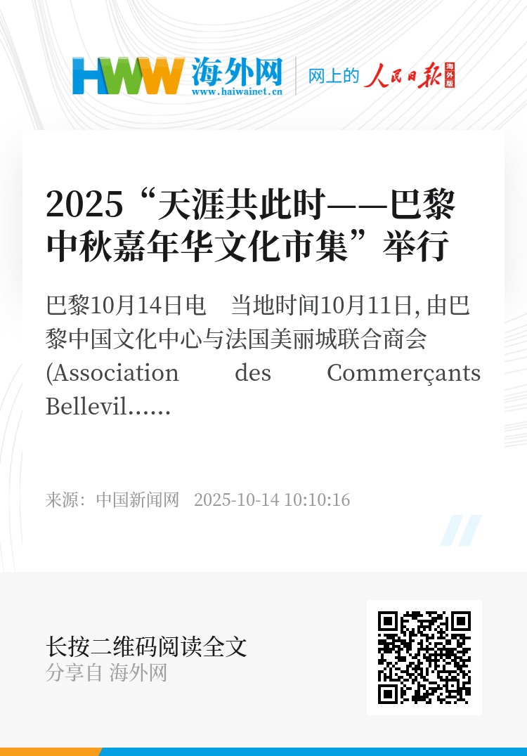 中新网巴黎10月14日电 当地时间10月11日,由巴黎中国文化中心与法国美丽城联合商会(Association des Commerçants Bellevillois)主办、巴黎市政府及相关区政府大力支持的2025“天涯共此时——巴黎中秋嘉年华文化市集”成功举办,活动涵盖舞台演出、民俗体验、美食品鉴与文化市集等多元内容,为法国公众、旅法华人带来一场中西合璧的节日盛会。