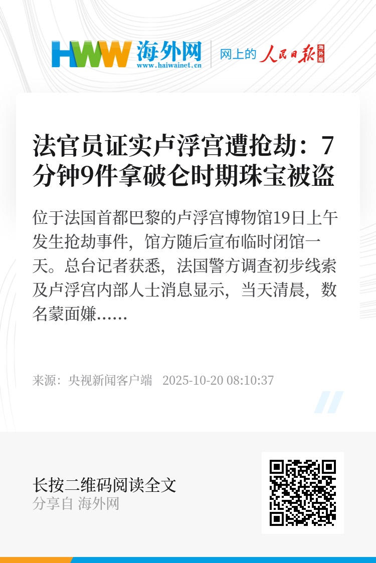 总台记者获悉,法国警方调查初步线索及卢浮宫内部人士消息显示,当天清晨,数名蒙面嫌犯从塞纳河一侧施工区闯入巴黎卢浮宫,利用升降电梯进入阿波罗画廊展区,打碎玻璃后盗走多件藏品。消息人士称,嫌犯盗走9件拿破仑时期的珠宝后逃离。