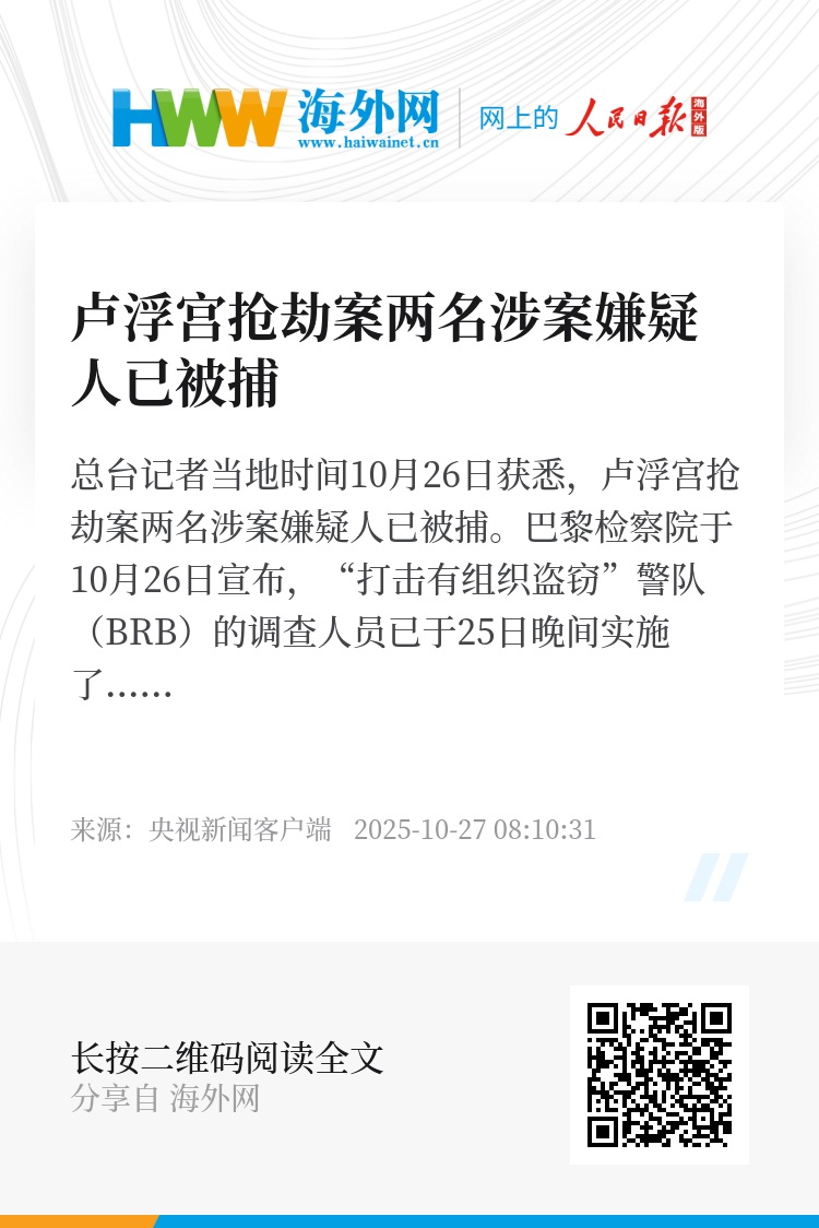 总台记者当地时间10月26日获悉,卢浮宫抢劫案两名涉案嫌疑人已被捕。