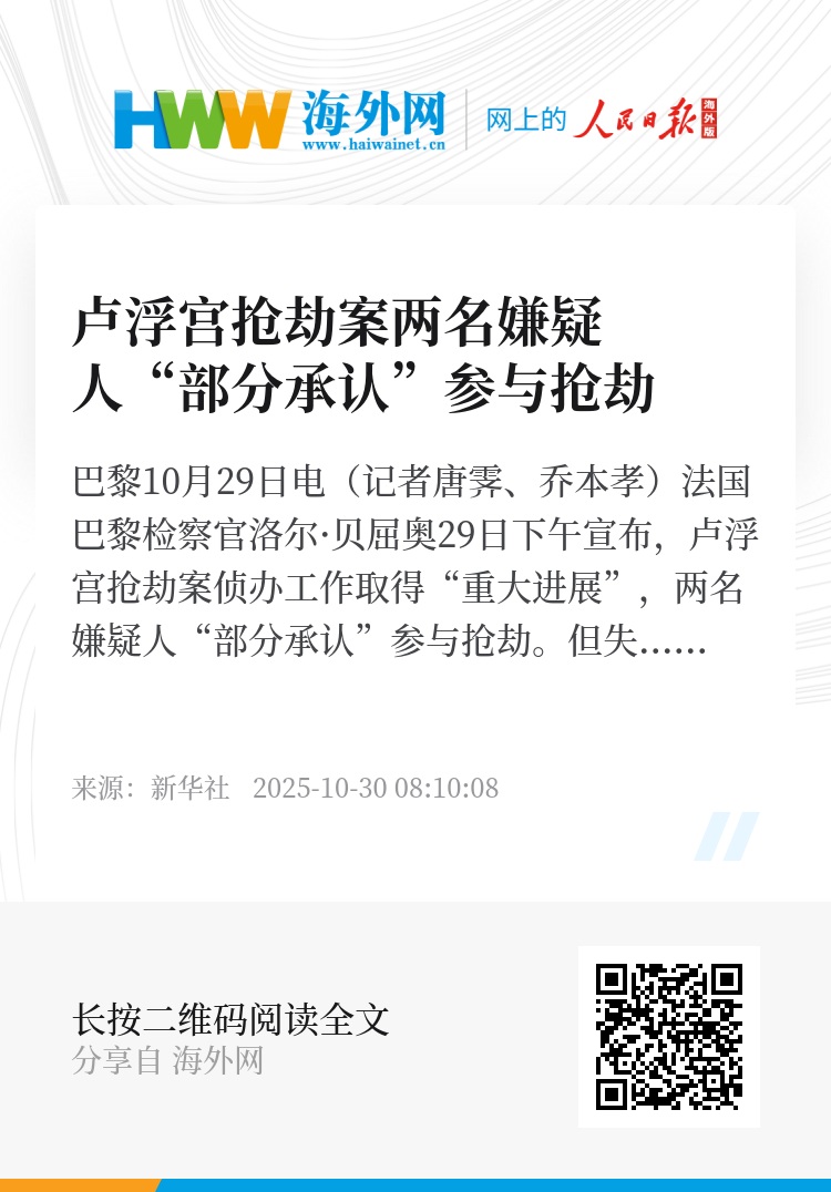 新华社巴黎10月29日电(记者唐霁、乔本孝)法国巴黎检察官洛尔·贝屈奥29日下午宣布,卢浮宫抢劫案侦办工作取得“重大进展”,两名嫌疑人“部分承认”参与抢劫。但失窃珠宝尚未被找到。