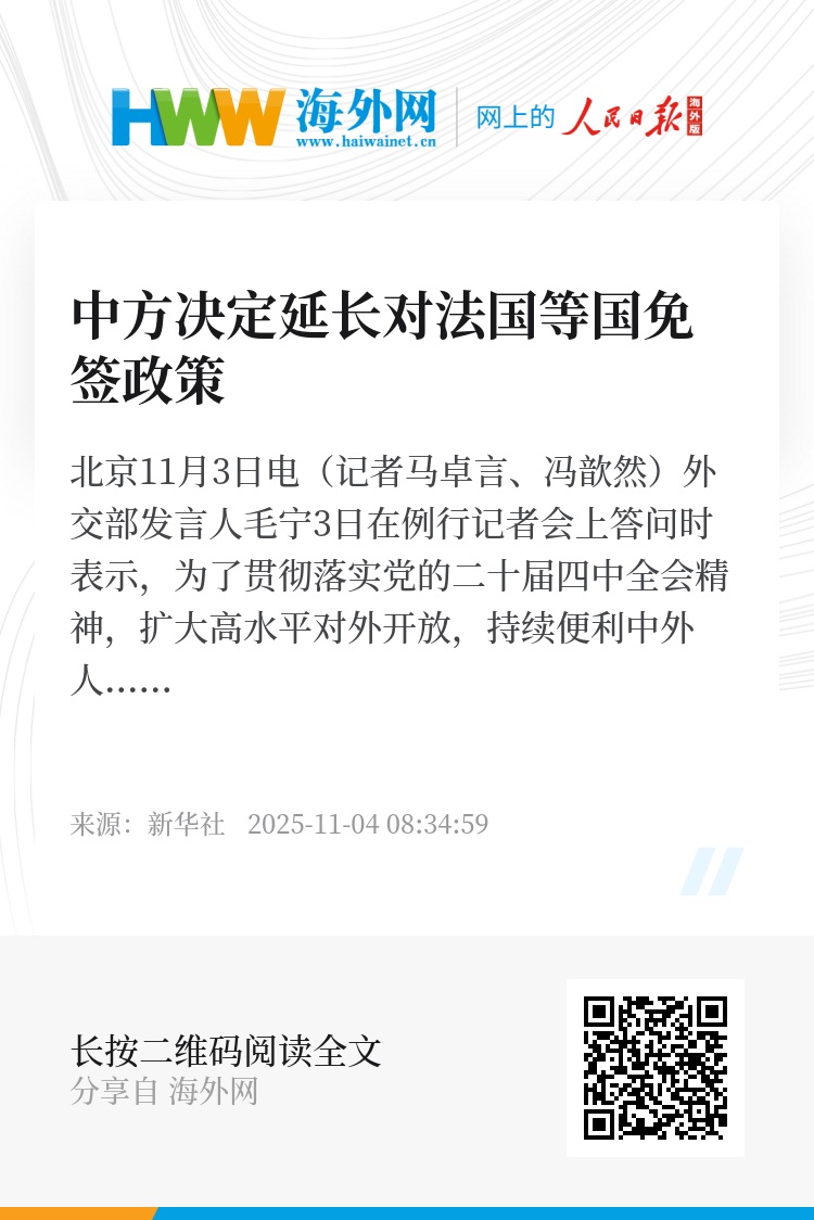 新华社北京11月3日电(记者马卓言、冯歆然)外交部发言人毛宁3日在例行记者会上答问时表示,为了贯彻落实党的二十届四中全会精神,扩大高水平对外开放,持续便利中外人员往来,中方决定将对法国等国的免签政策延长至2026年12月31日。此外,中方将于2025年11月10日至2026年12月31日对瑞典免签。