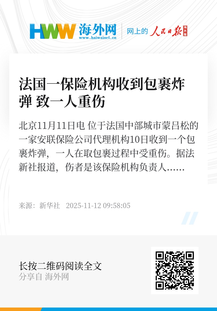 新华社北京11月11日电 位于法国中部城市蒙吕松的一家安联保险公司代理机构10日收到一个包裹炸弹,一人在取包裹过程中受重伤。
