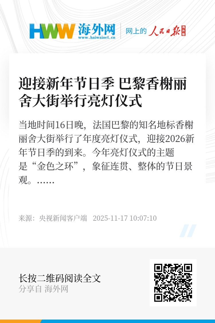 当地时间16日晚,法国巴黎的知名地标香榭丽舍大街举行了年度亮灯仪式,迎接2026新年节日季的到来。