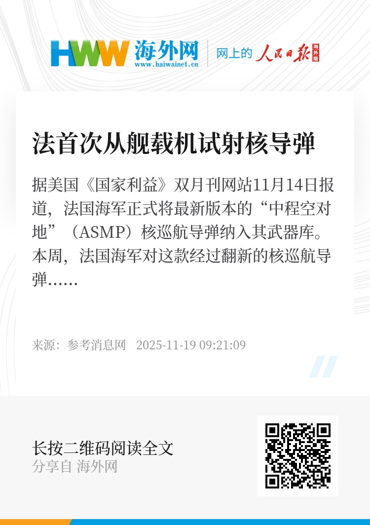 据美国《国家利益》双月刊网站11月14日报道,法国海军正式将最新版本的“中程空对地”(ASMP)核巡航导弹纳入其武器库。