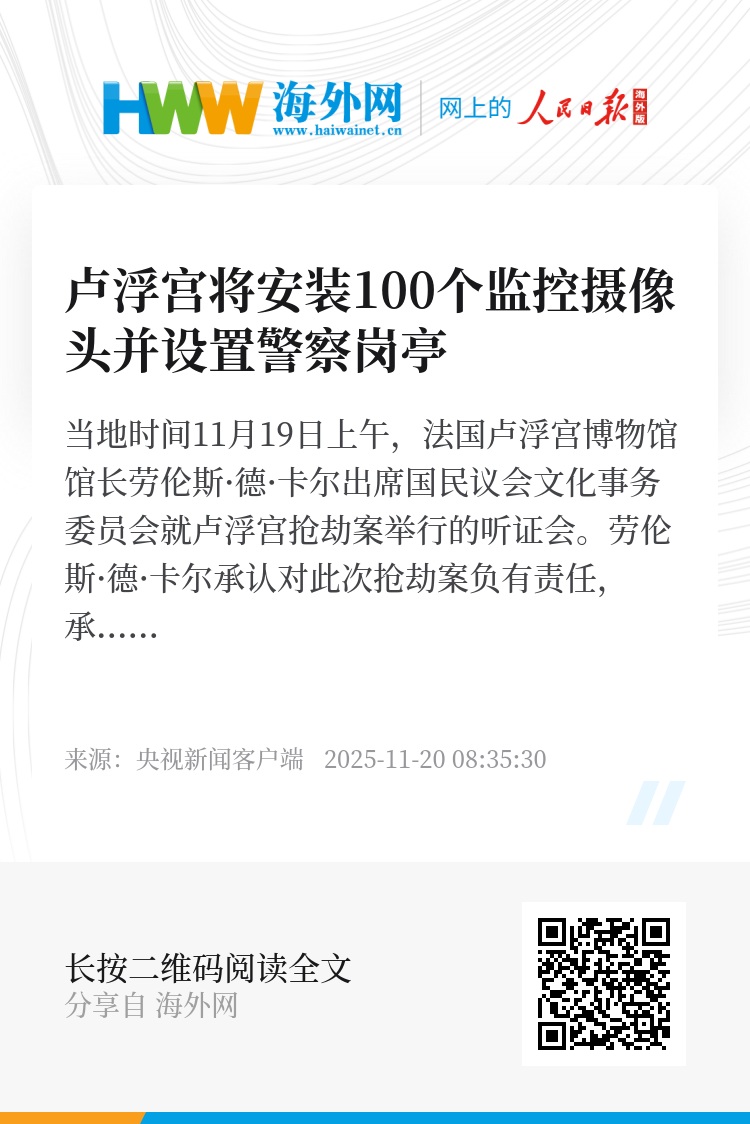自卢浮宫发生抢劫案后,博物馆的安保体系已遭到广泛质疑。劳伦斯·德·卡尔此前也就此问题在参议院接受听证,承认卢浮宫安保系统存在外围薄弱、长期投入不足和升级滞后等缺陷,并初步提出整改措施。(总台记者 白洁)