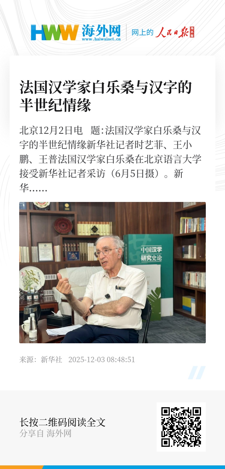 新华社北京12月2日电 题:法国汉学家白乐桑与汉字的半世纪情缘