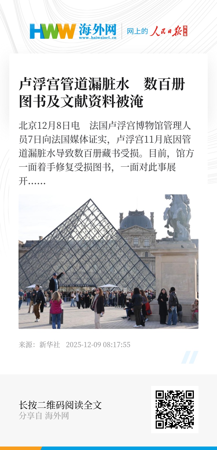 新华社北京12月8日电 法国卢浮宫博物馆管理人员7日向法国媒体证实,卢浮宫11月底因管道漏脏水导致数百册藏书受损。目前,馆方一面着手修复受损图书,一面对此事展开详细调查。