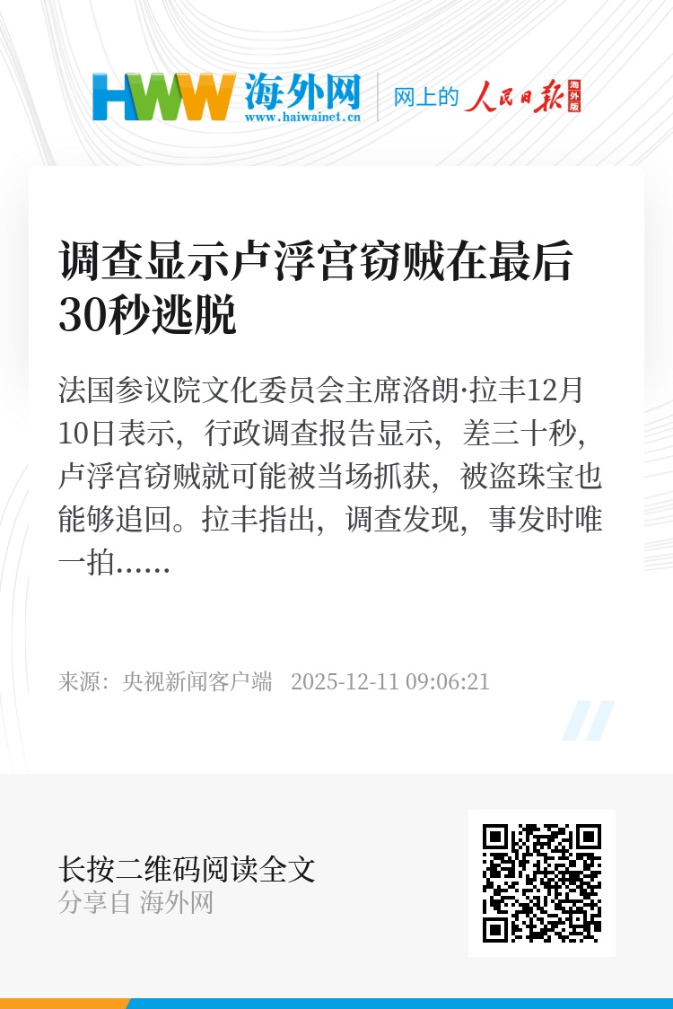 法国参议院文化委员会主席洛朗·拉丰12月10日表示,行政调查报告显示,差三十秒,卢浮宫窃贼就可能被当场抓获,被盗珠宝也能够追回。
