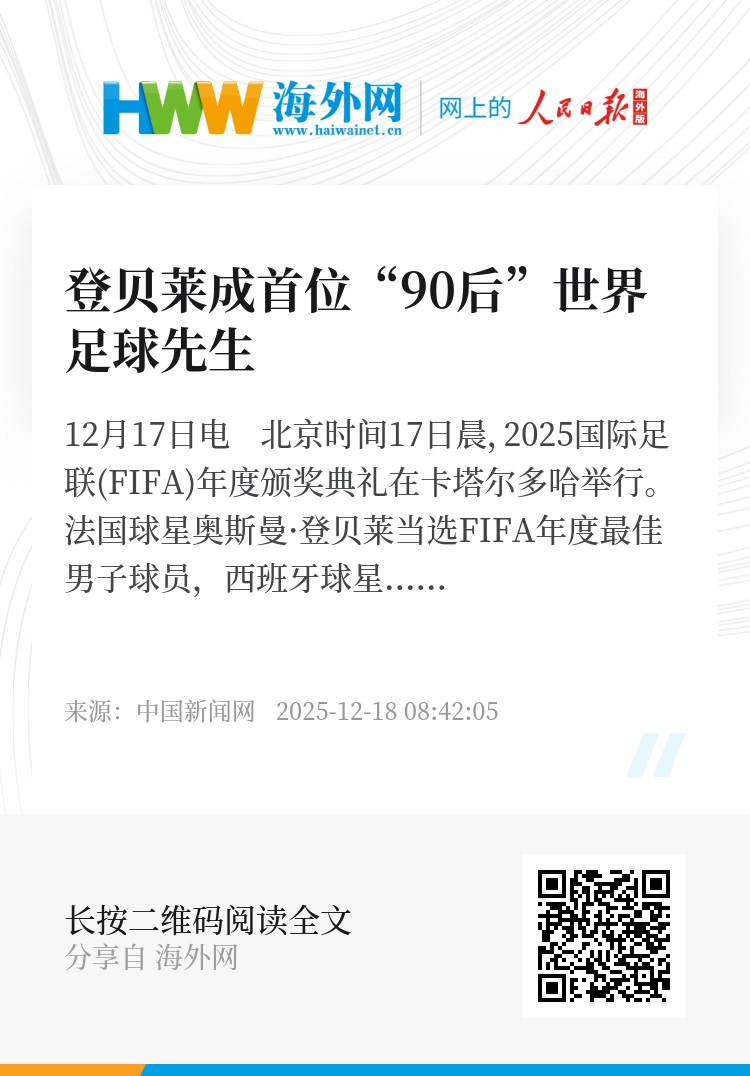 中新网12月17日电 北京时间17日晨,2025国际足联(FIFA)年度颁奖典礼在卡塔尔多哈举行。法国球星奥斯曼·登贝莱当选FIFA年度最佳男子球员,西班牙球星艾塔纳·邦马蒂蝉联FIFA年度最佳女子球员。