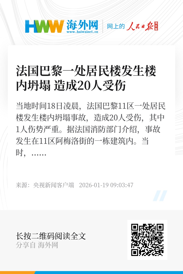 当地时间18日凌晨,法国巴黎11区一处居民楼发生楼内坍塌事故,造成20人受伤,其中1人伤势严重。