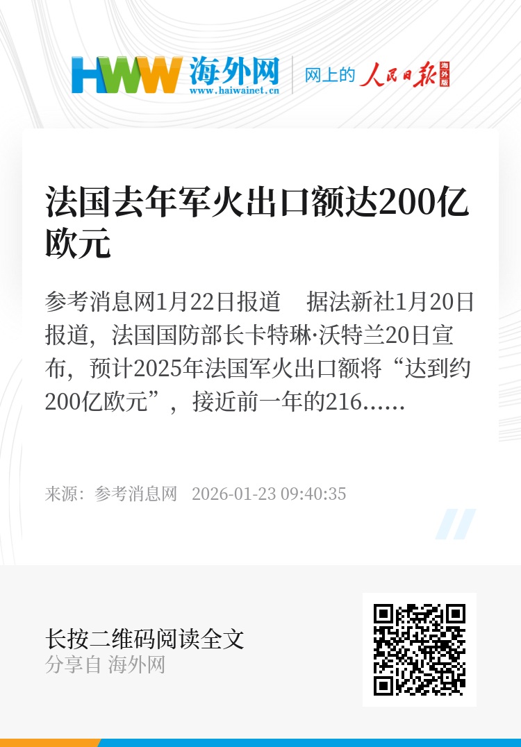 参考消息网1月22日报道 据法新社1月20日报道,法国国防部长卡特琳·沃特兰20日宣布,预计2025年法国军火出口额将“达到约200亿欧元”,接近前一年的216亿欧元。