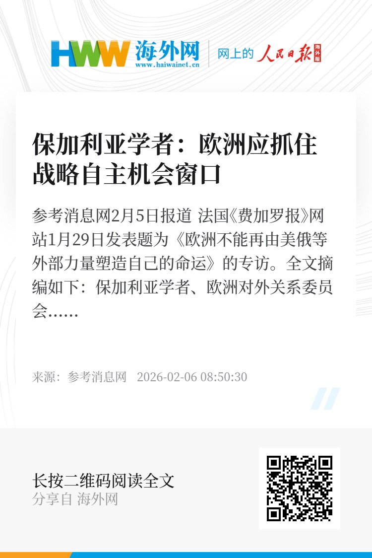保加利亚学者、欧洲对外关系委员会研究部主任伊万·克勒斯特夫在接受本报专访时表示,随着特朗普尝试对格陵兰岛强行动手,欧洲各国迎来一个让包括民粹主义者在内的各派政治力量形成新共识的机会窗口,要赋予欧洲真正的战略自主。