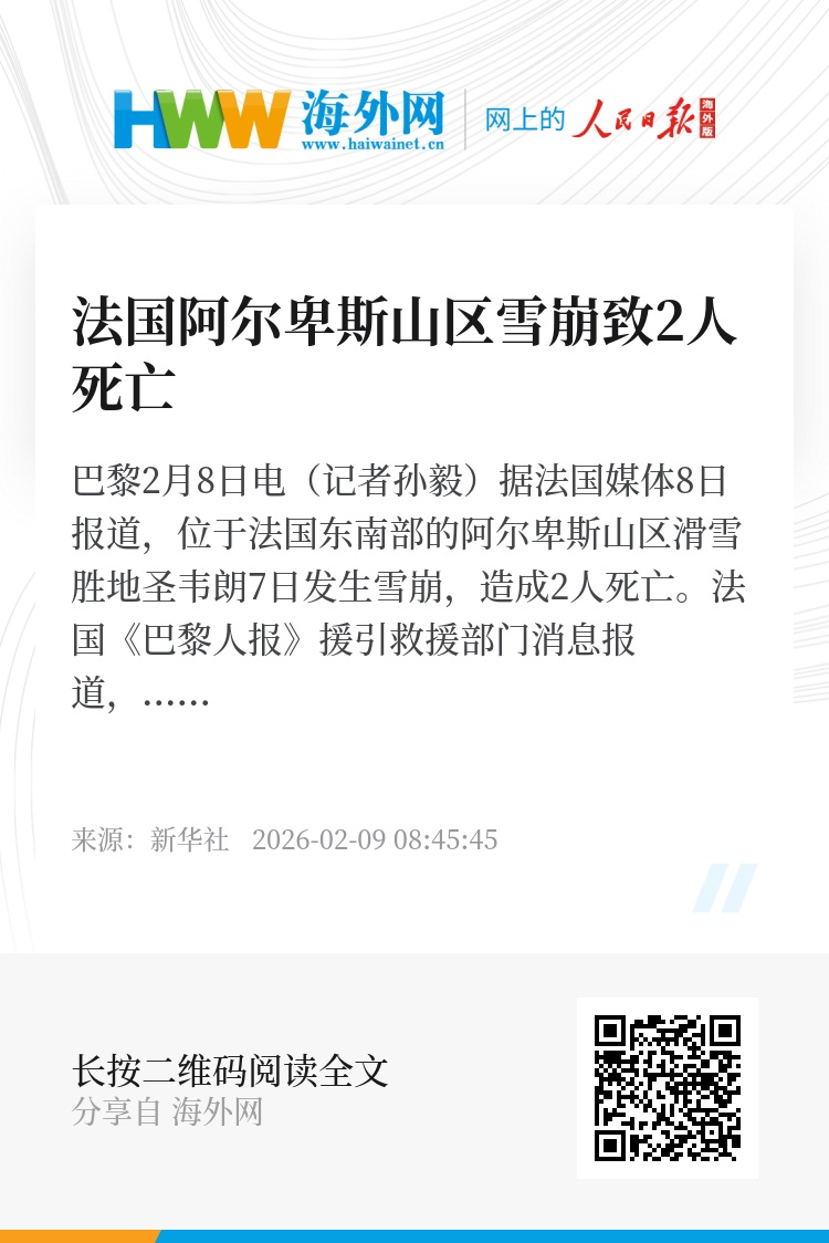 新华社巴黎2月8日电(记者孙毅)据法国媒体8日报道,位于法国东南部的阿尔卑斯山区滑雪胜地圣韦朗7日发生雪崩,造成2人死亡。