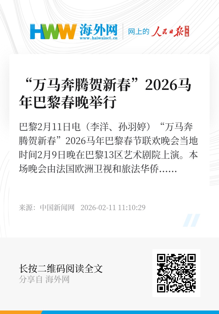 中新网巴黎2月11日电(李洋、孙羽婷)“万马奔腾贺新春”2026马年巴黎春节联欢晚会当地时间2月9日晚在巴黎13区艺术剧院上演。