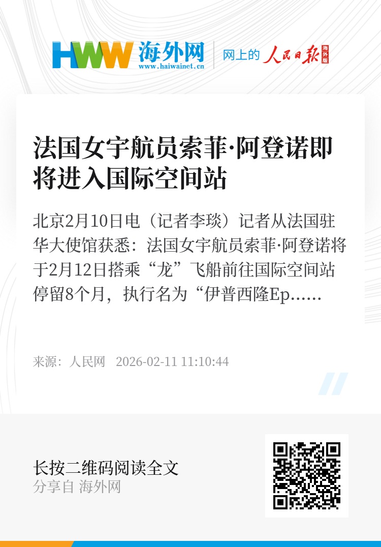 人民网北京2月10日电(记者李琰)记者从法国驻华大使馆获悉:法国女宇航员索菲·阿登诺将于2月12日搭乘“龙”飞船前往国际空间站停留8个月,执行名为“伊普西隆Epsilon”的任务。25年前,克洛迪·艾涅尔成为第一位入驻国际太空站的法国女性。
