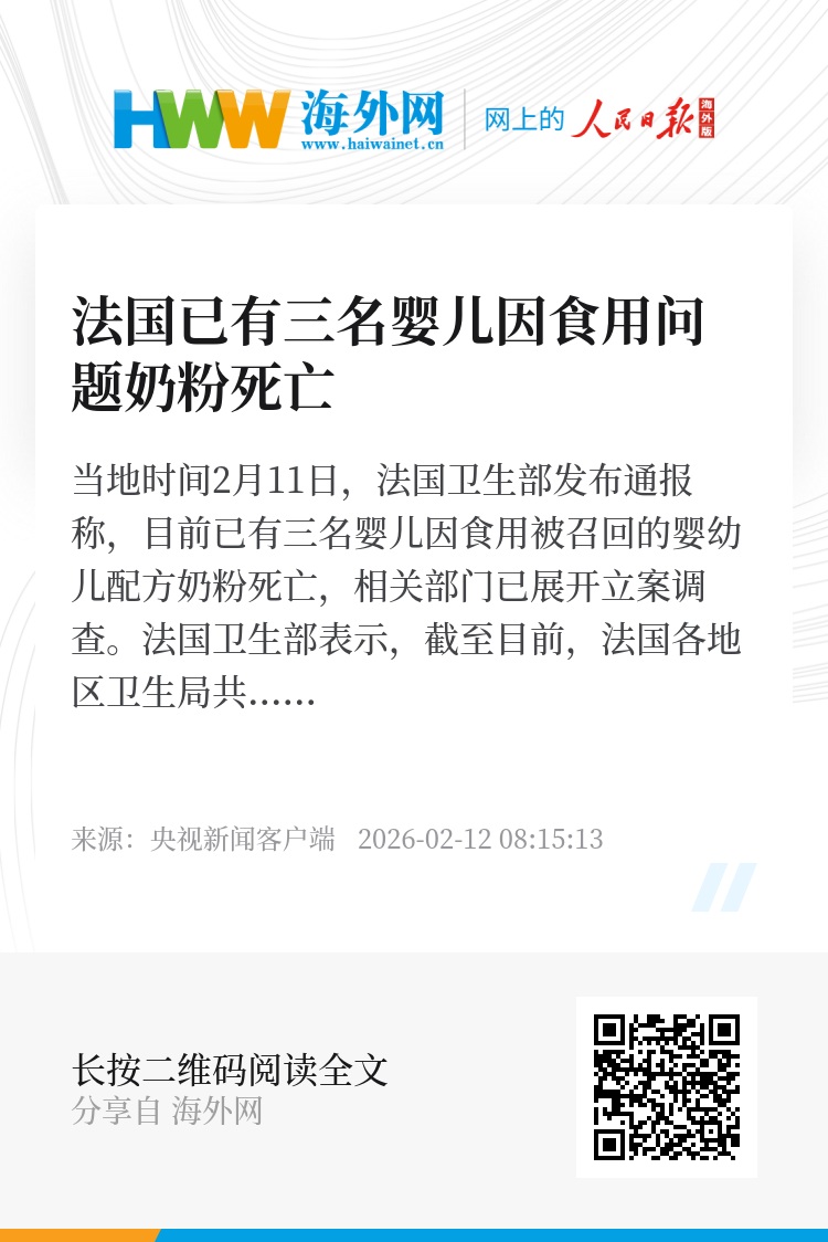 当地时间2月11日,法国卫生部发布通报称,目前已有三名婴儿因食用被召回的婴幼儿配方奶粉死亡,相关部门已展开立案调查。