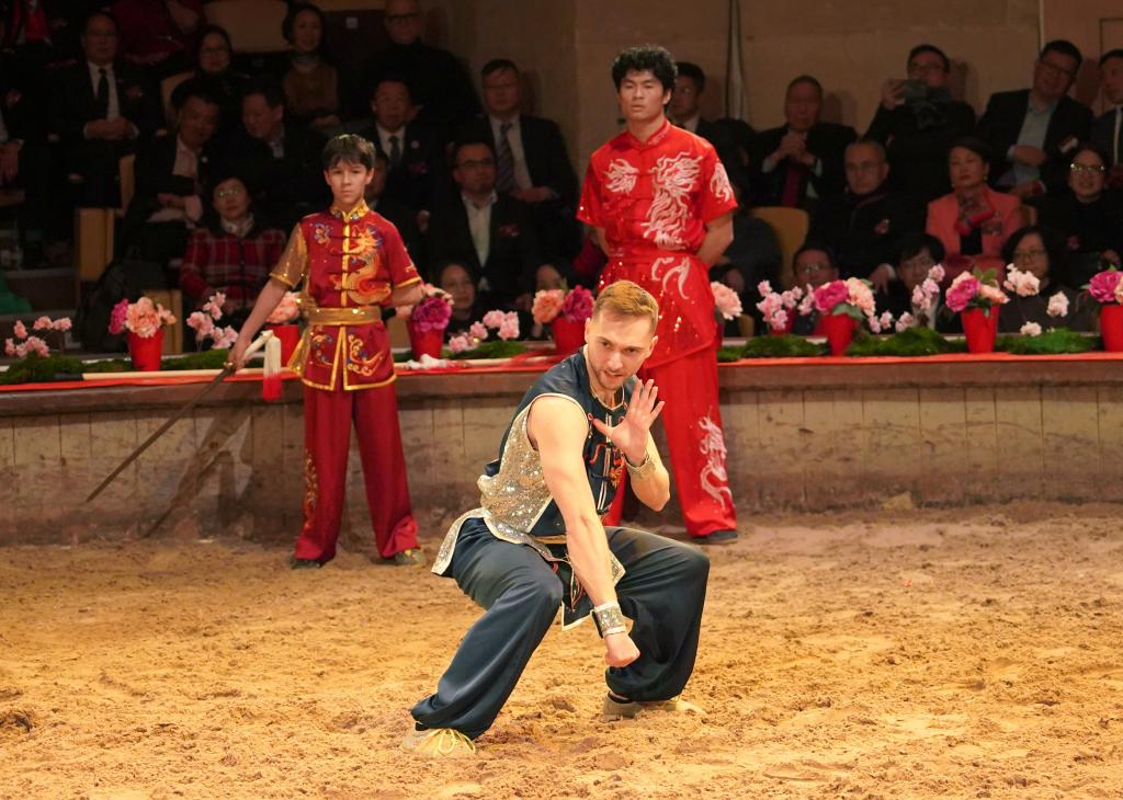 2月11日,在法国北部的尚蒂伊城堡,演员表演武术。新华社记者 崔可欣 摄