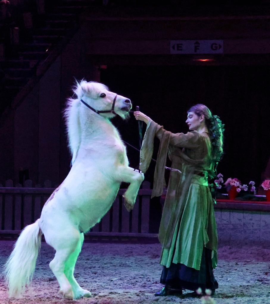 与法国各地常见的春节庆典不同,这场晚会的“重头戏”是一项更具本土特色的艺术形式——法国传统马术。舞台设在大马厩圆形穹顶下的沙地上,背景声不只是扩音器里的悠扬乐曲,还伴着马匹奔跑与跃动的节奏。