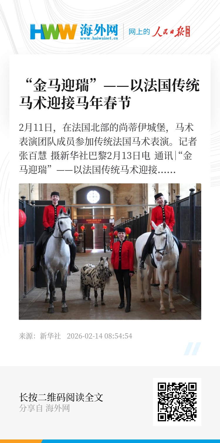 法国传统马术和中国春节分别于2011年和2024年入选联合国教科文组织人类非物质文化遗产代表作名录。在比奈梅看来,两项中法文化瑰宝在尚蒂伊的相遇“十分美妙”。她说,马术追求“轻盈灵动、人马和谐”,希望通过表演让更多人爱上马,也祝愿“马的力量与勇气为中国朋友带来好运”。