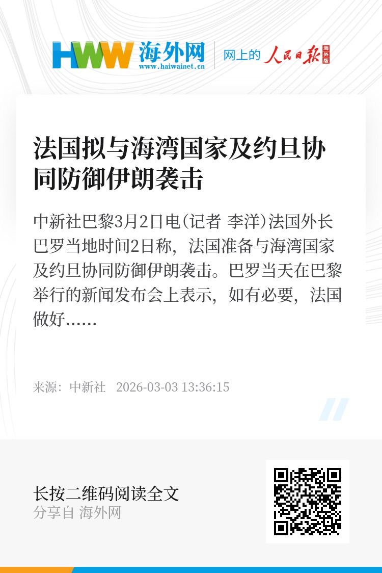 中新社巴黎3月2日电(记者 李洋)法国外长巴罗当地时间2日称,法国准备与海湾国家及约旦协同防御伊朗袭击。