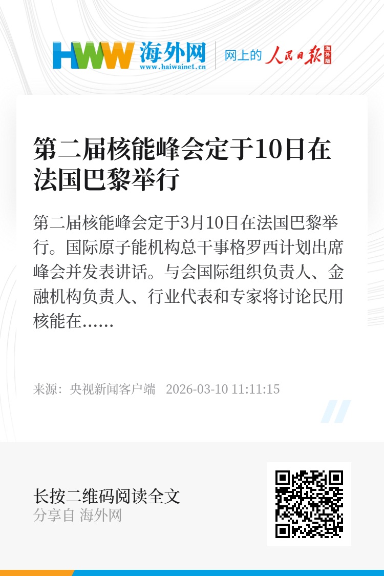 第二届核能峰会定于3月10日在法国巴黎举行。国际原子能机构总干事格罗西计划出席峰会并发表讲话。与会国际组织负责人、金融机构负责人、行业代表和专家将讨论民用核能在应对重大能源和气候挑战中的作用。