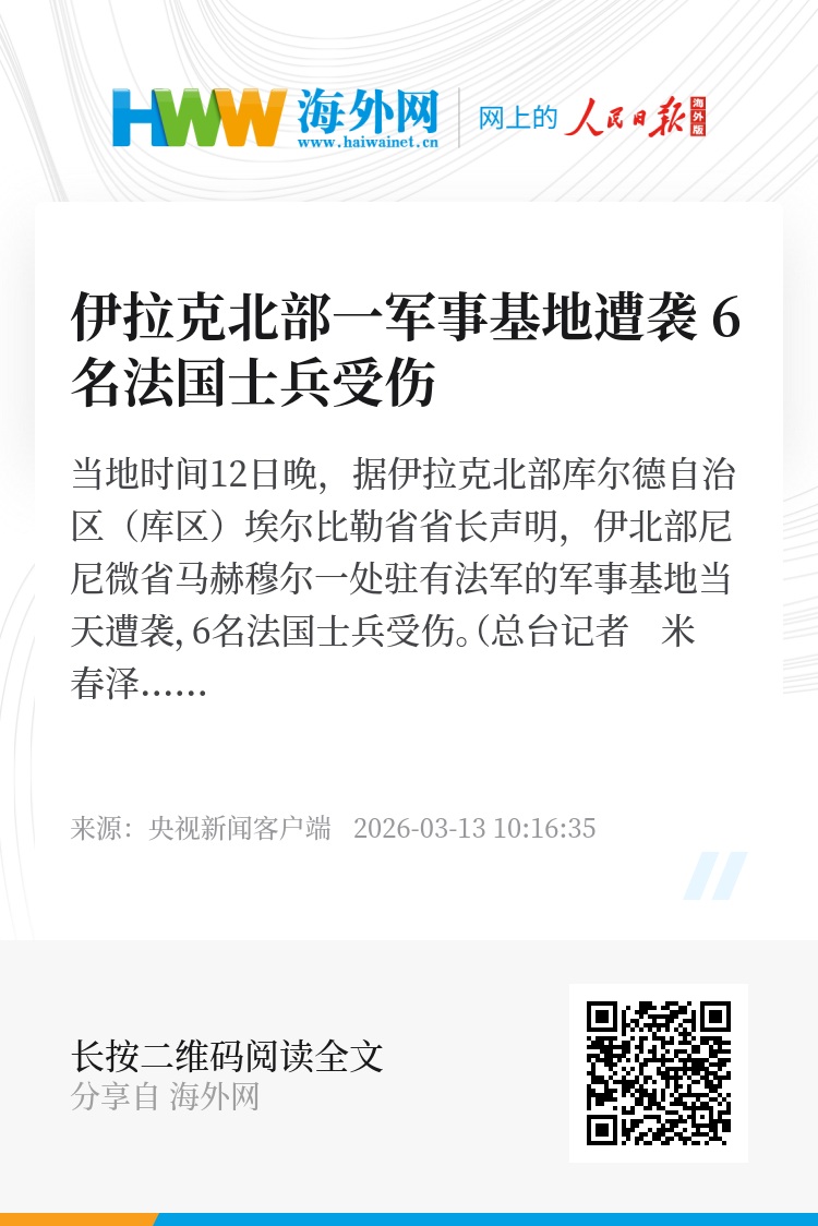 当地时间12日晚,据伊拉克北部库尔德自治区(库区)埃尔比勒省省长声明,伊北部尼尼微省马赫穆尔一处驻有法军的军事基地当天遭袭,6名法国士兵受伤。(总台记者 米春泽)