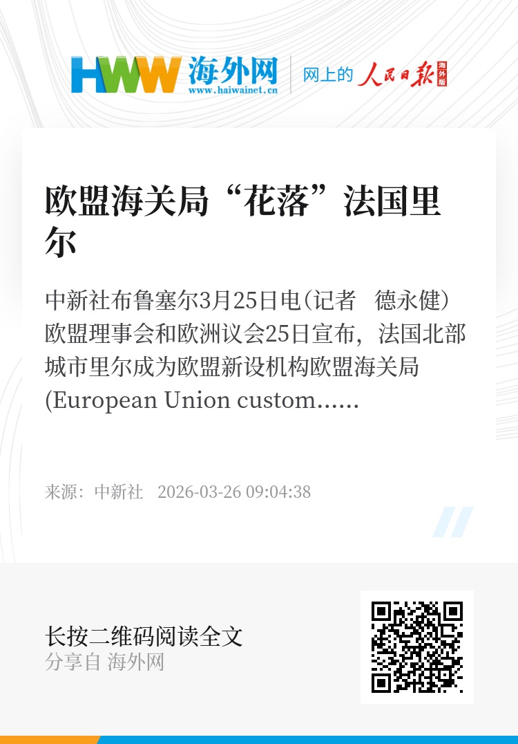 中新社布鲁塞尔3月25日电(记者 德永健)欧盟理事会和欧洲议会25日宣布,法国北部城市里尔成为欧盟新设机构欧盟海关局(European Union customs authority)总部所在地。