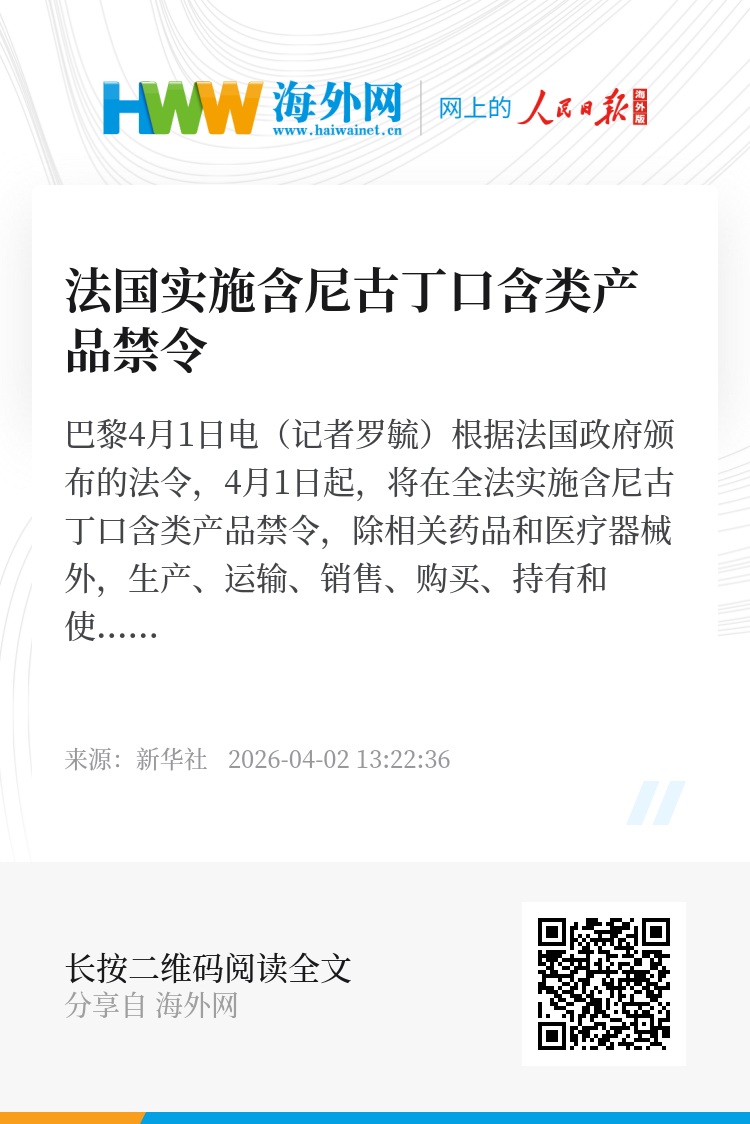 新华社巴黎4月1日电(记者罗毓)根据法国政府颁布的法令,4月1日起,将在全法实施含尼古丁口含类产品禁令,除相关药品和医疗器械外,生产、运输、销售、购买、持有和使用这类产品均属非法。