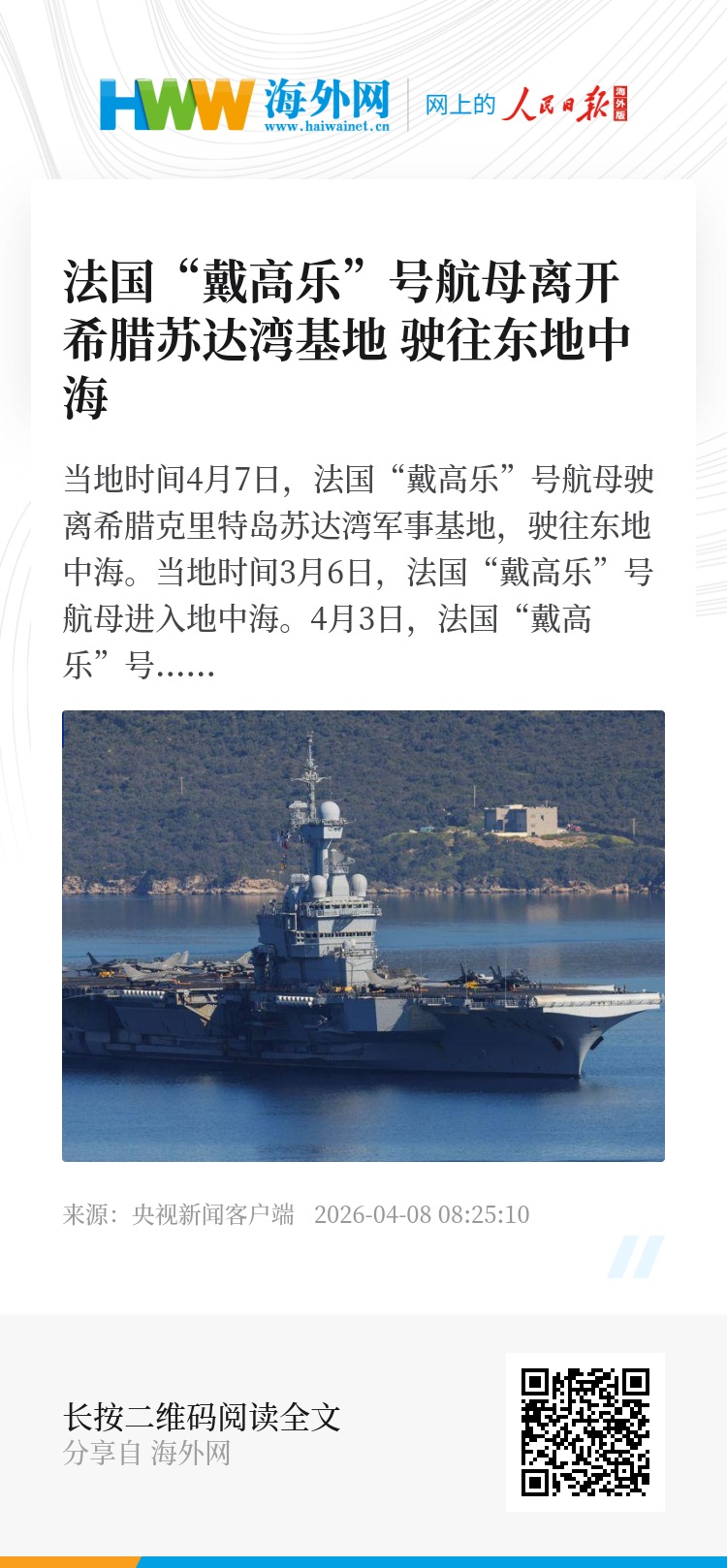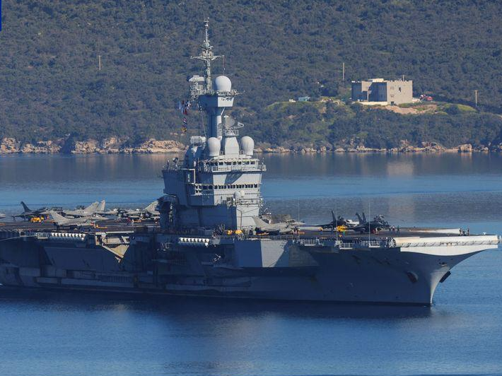 当地时间4月7日,法国“戴高乐”号航母驶离希腊克里特岛苏达湾军事基地,驶往东地中海。