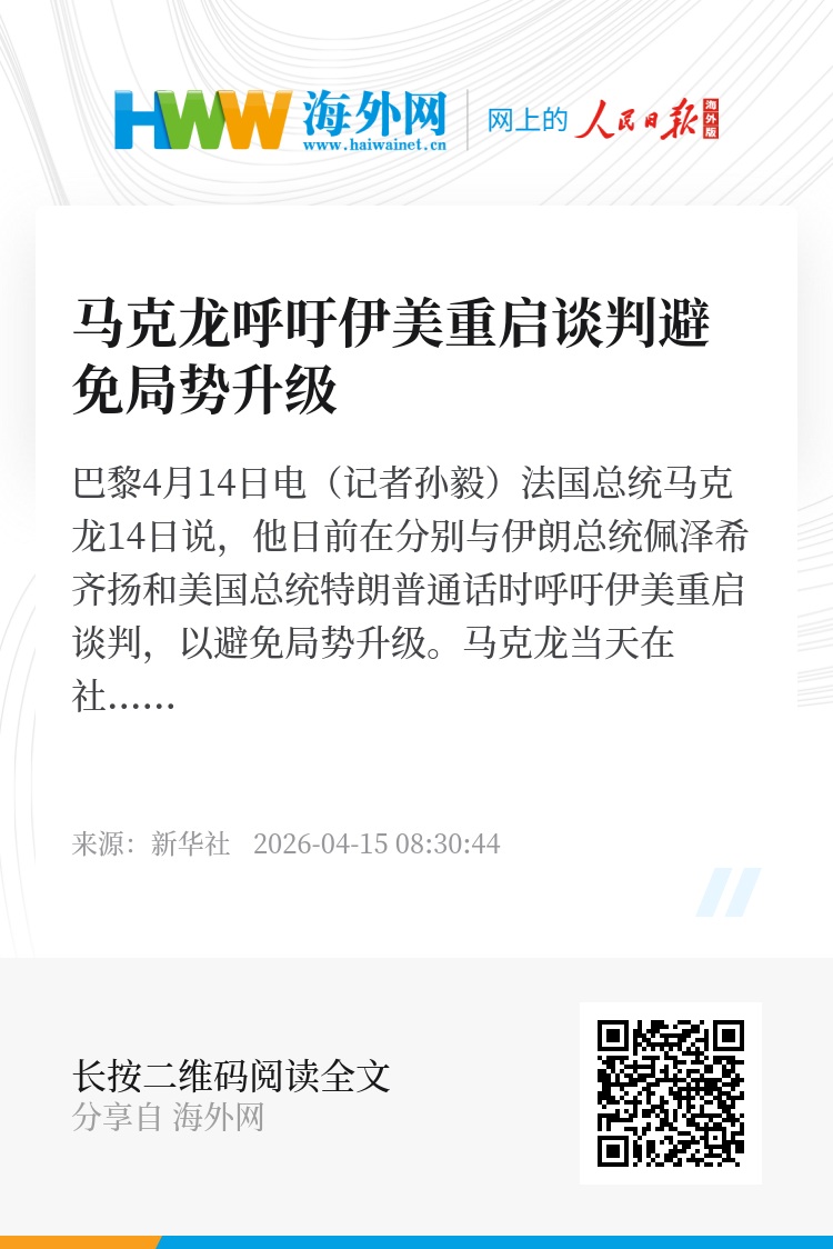 新华社巴黎4月14日电(记者孙毅)法国总统马克龙14日说,他日前在分别与伊朗总统佩泽希齐扬和美国总统特朗普通话时呼吁伊美重启谈判,以避免局势升级。
